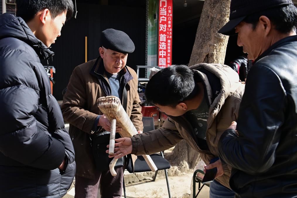 2月13日,李学员(左二)在焦岱大集上向顾客介绍自制的手工凳子。新华社记者邹竞一 摄